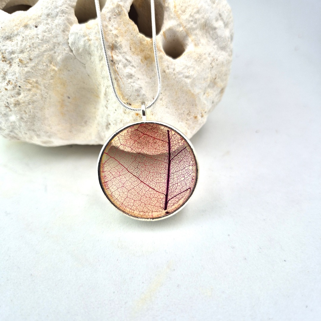 Deze mooie metalen roze bladhanger is gemaakt met het bladskelet van de Lindeboom, die is gekleurd met verschillende kleuren roze inkt en ingegoten in een transparante Uv epoxy hars.