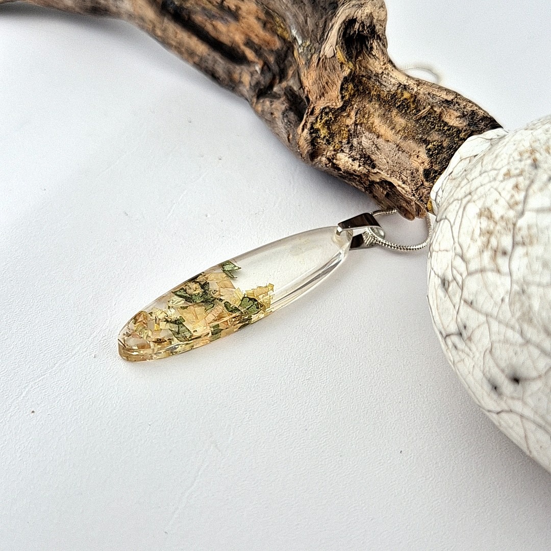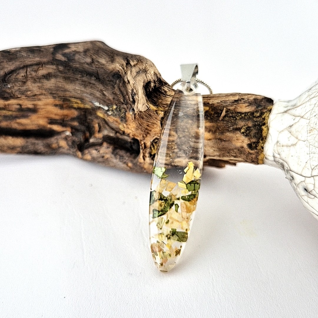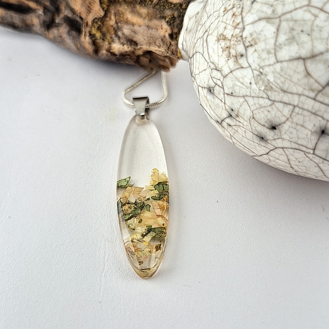 De handgemaakte ovale Hanger van Epoxy met Bloemen fragmenten kan zowel aan een lange ketting op een trui maar ook aan een korte ketting hoog in de hals gedragen worden.