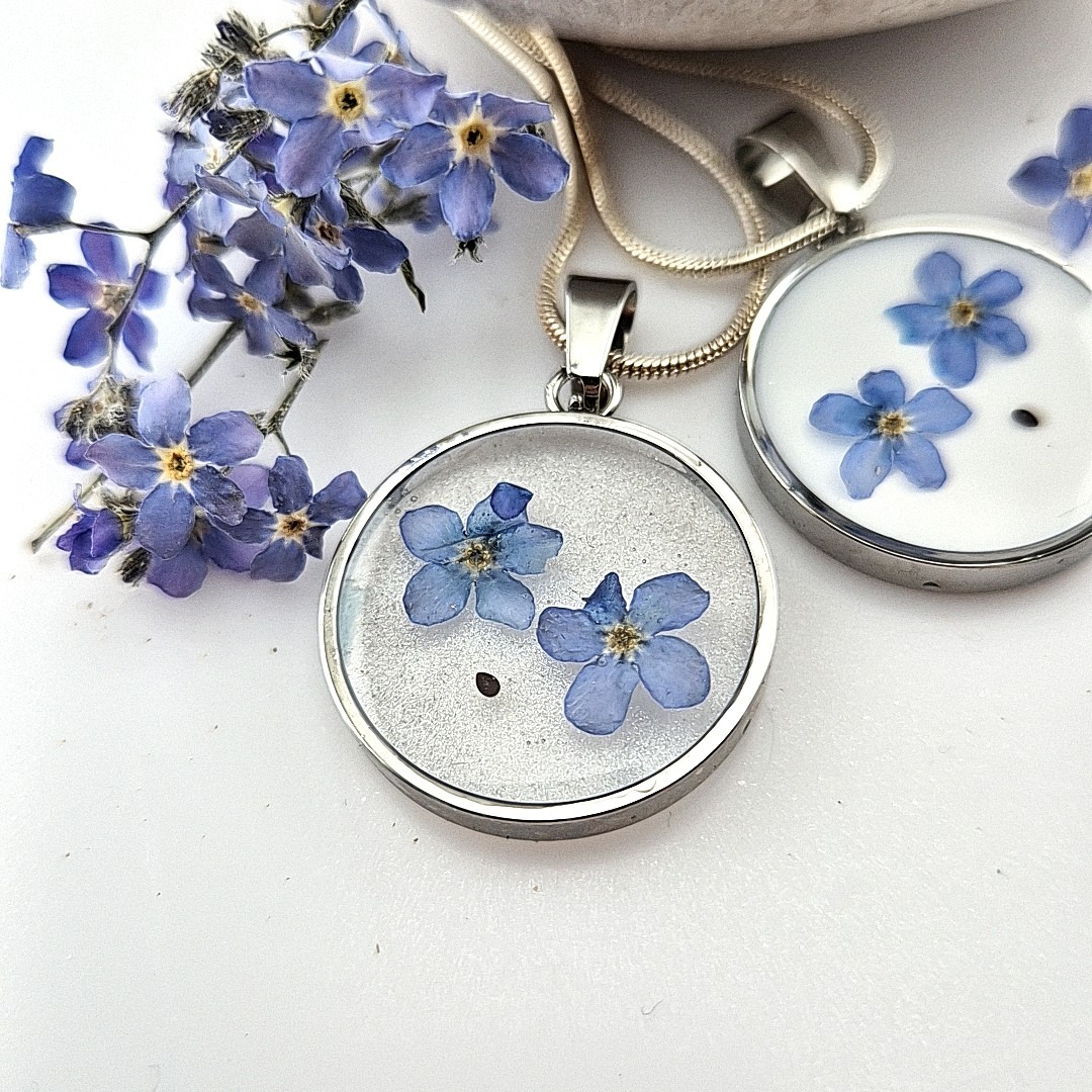Deze bijzondere stainless steel hanger is met zorg en aandacht gemaakt om een kostbare herinnering te bewaren. In het hart van het sieraad liggen gedroogde vergeet-mij-nietjes, omringd door een transparante UV-epoxy die hun zachte kleuren beschermt en laat stralen. Tussen de bloemblaadjes bevindt zich een klein zaadje – een symbool van het leven dat zo kort bij je was, maar voor altijd in je hart blijft.