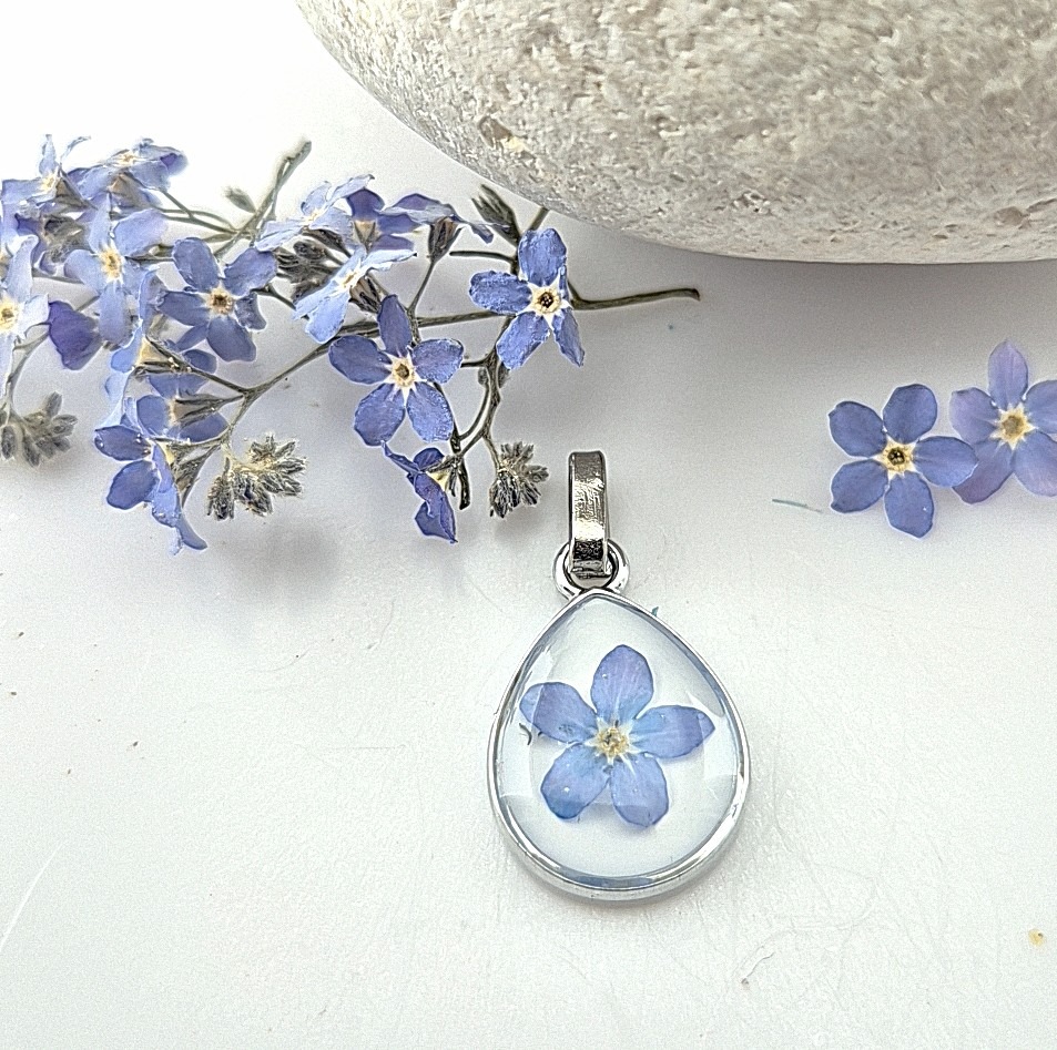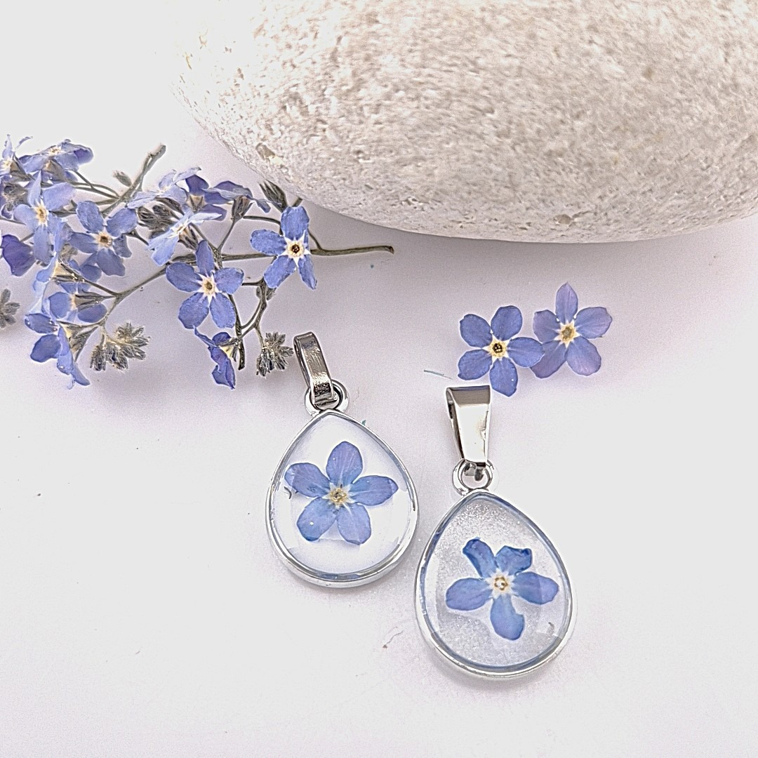 De hanger met subtiele rand word gevuld met gedroogde Vergeet mij nietje gecombineerd met een transparante Uv epoxy hars.