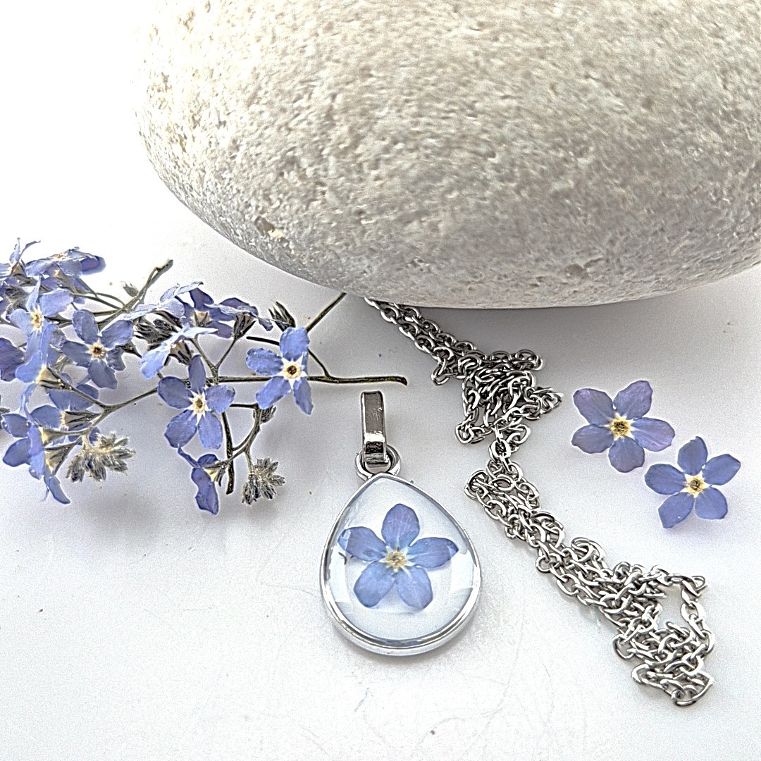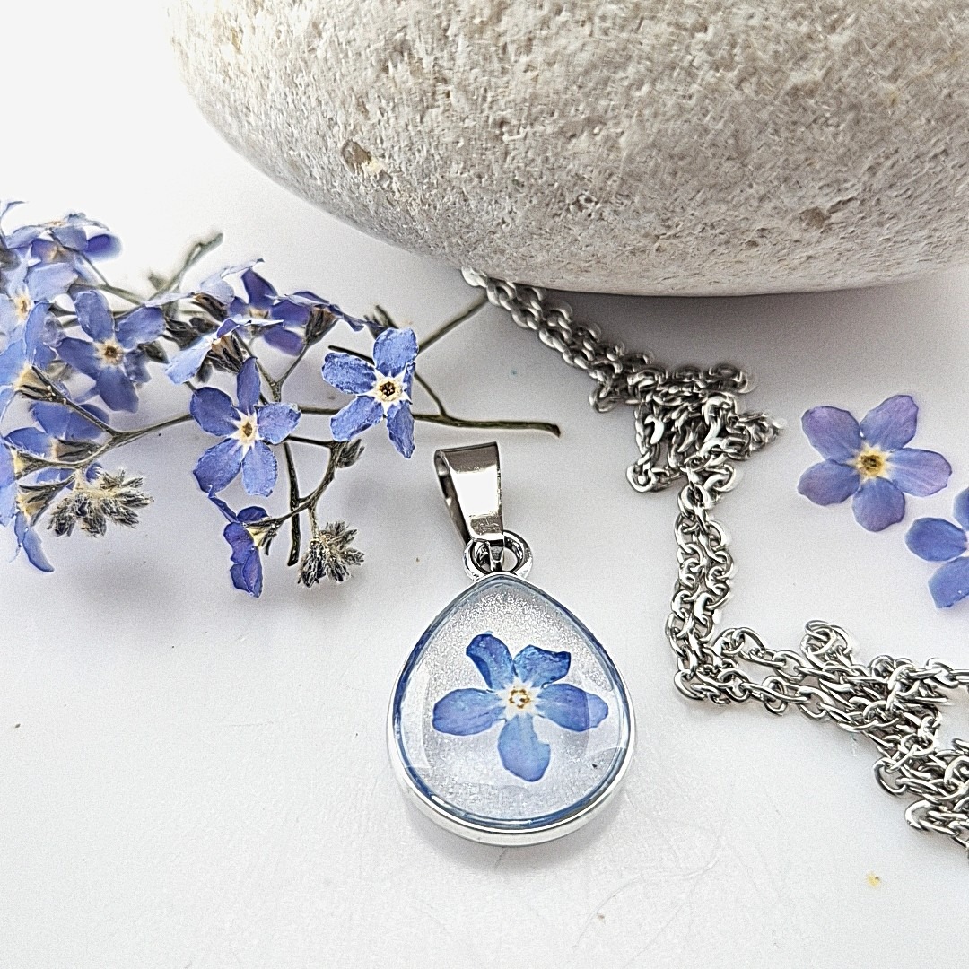 Deze prachtige kleine RVS metalen druppel miskraam sieraad met Vergeet mij nietje is met zorg en liefde handgemaakt. In het hart van de hanger vind je gedroogde vergeet-mij-nietje, afkomstig uit mijn eigen tuin.