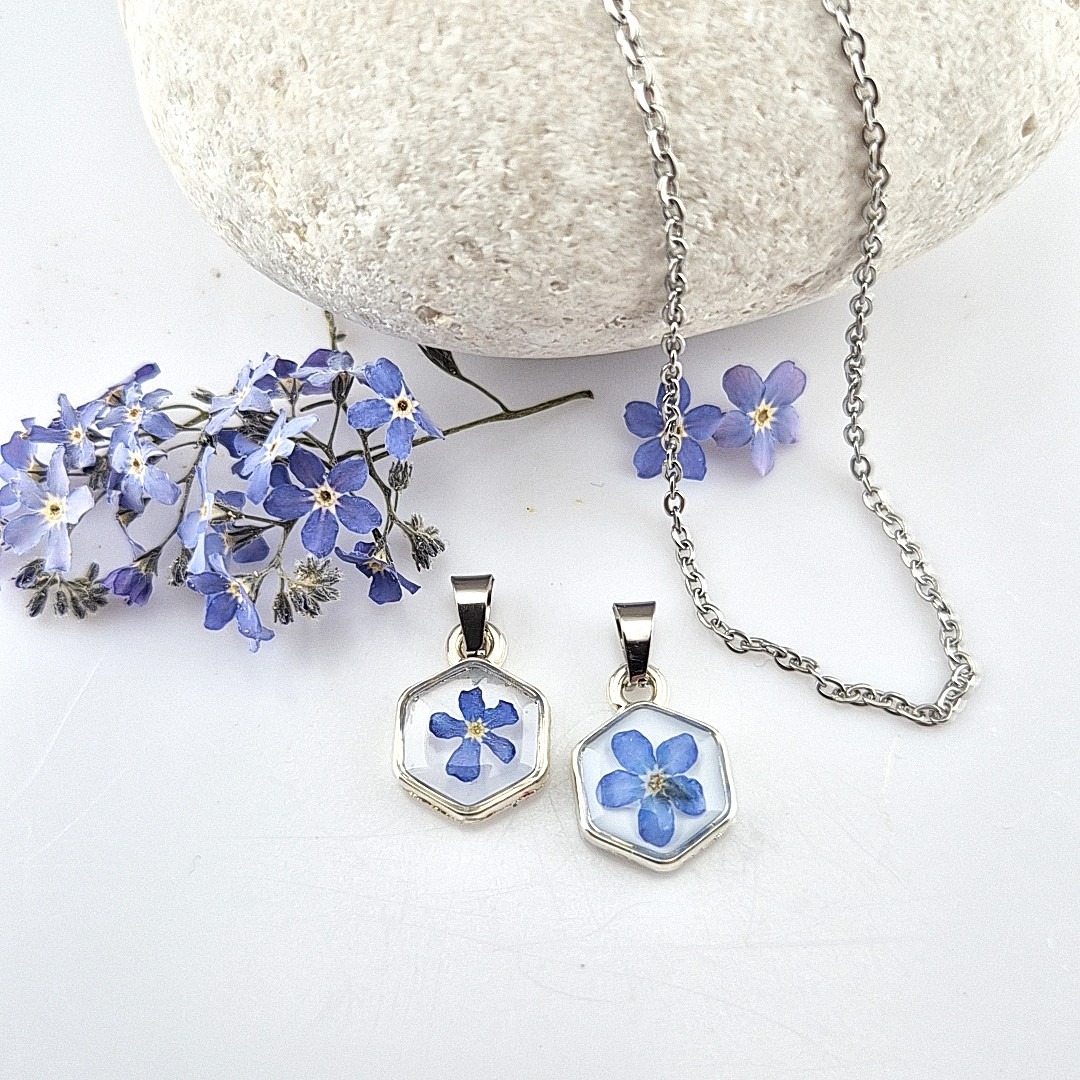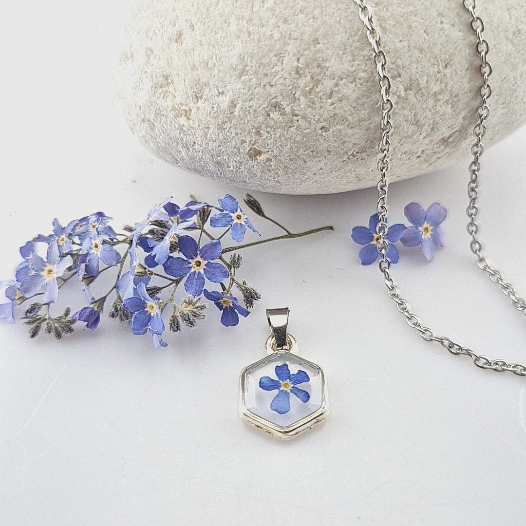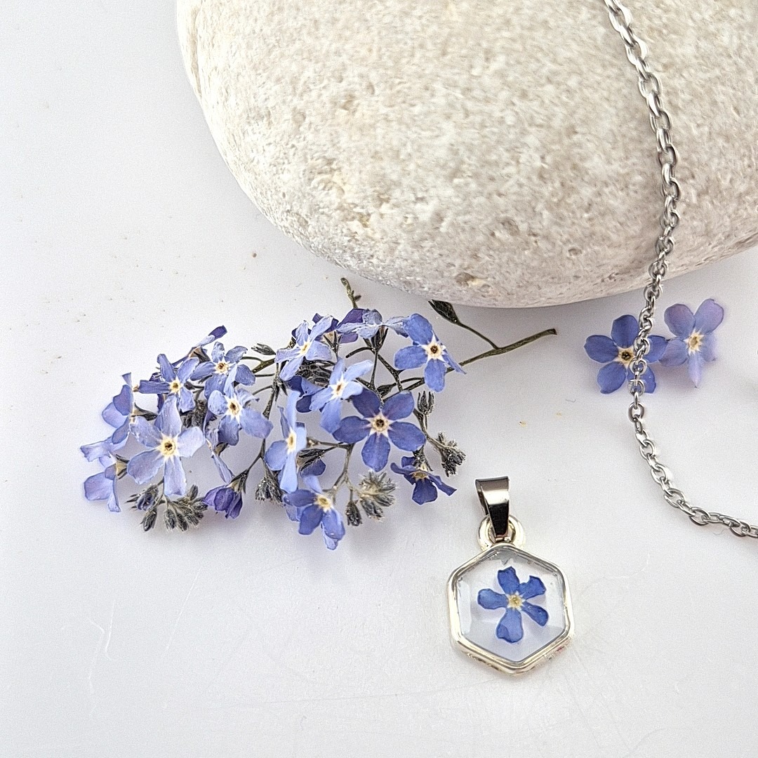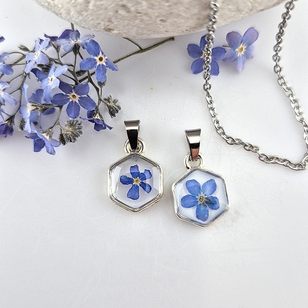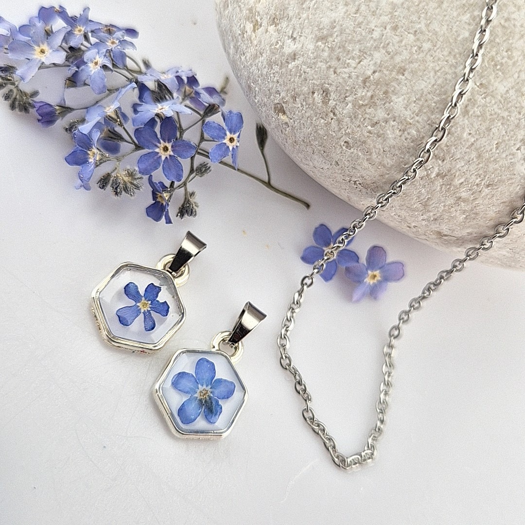 Een subtiel sieraad met een bijzonder verhaal, deze prachtige metalen Zeshoekige epoxy hanger met vergeet‑mij‑nietje is gevuld met een gedroogd vergeet-mij-nietje, zorgvuldig geplukt uit mijn eigen tuin. Na het drogen heb ik het bloemetje met liefde ingegoten in een transparante, UV-bestendige epoxy, zodat het zijn kleur en schoonheid jarenlang behoudt.