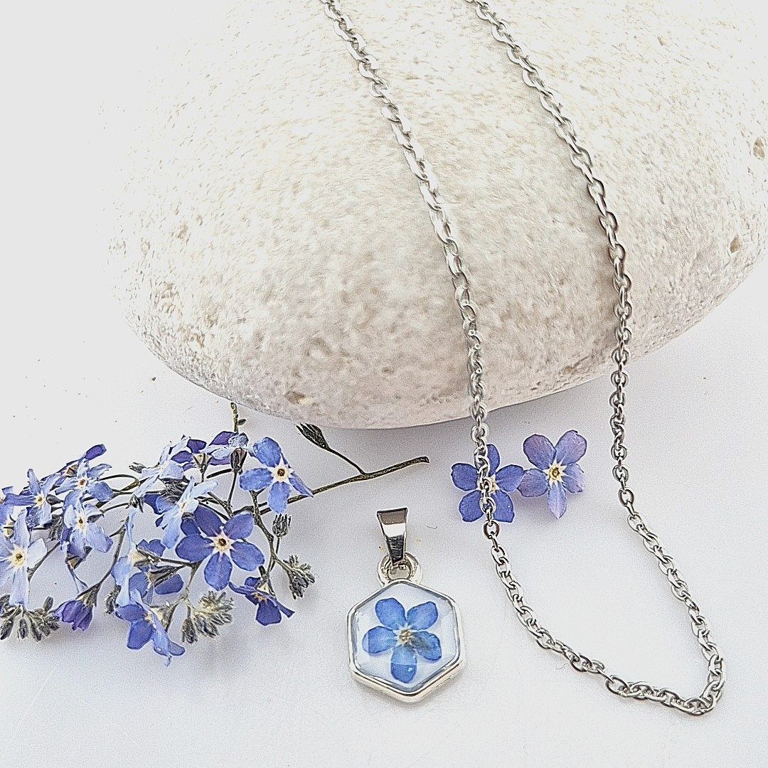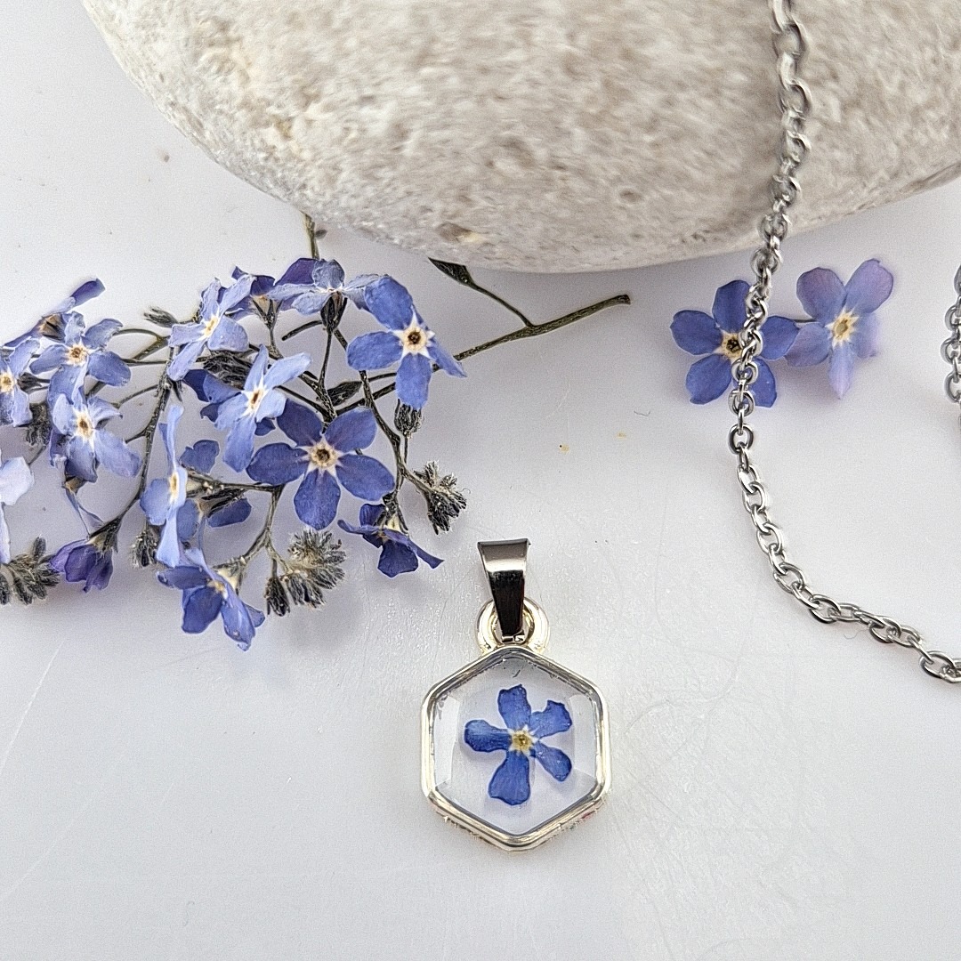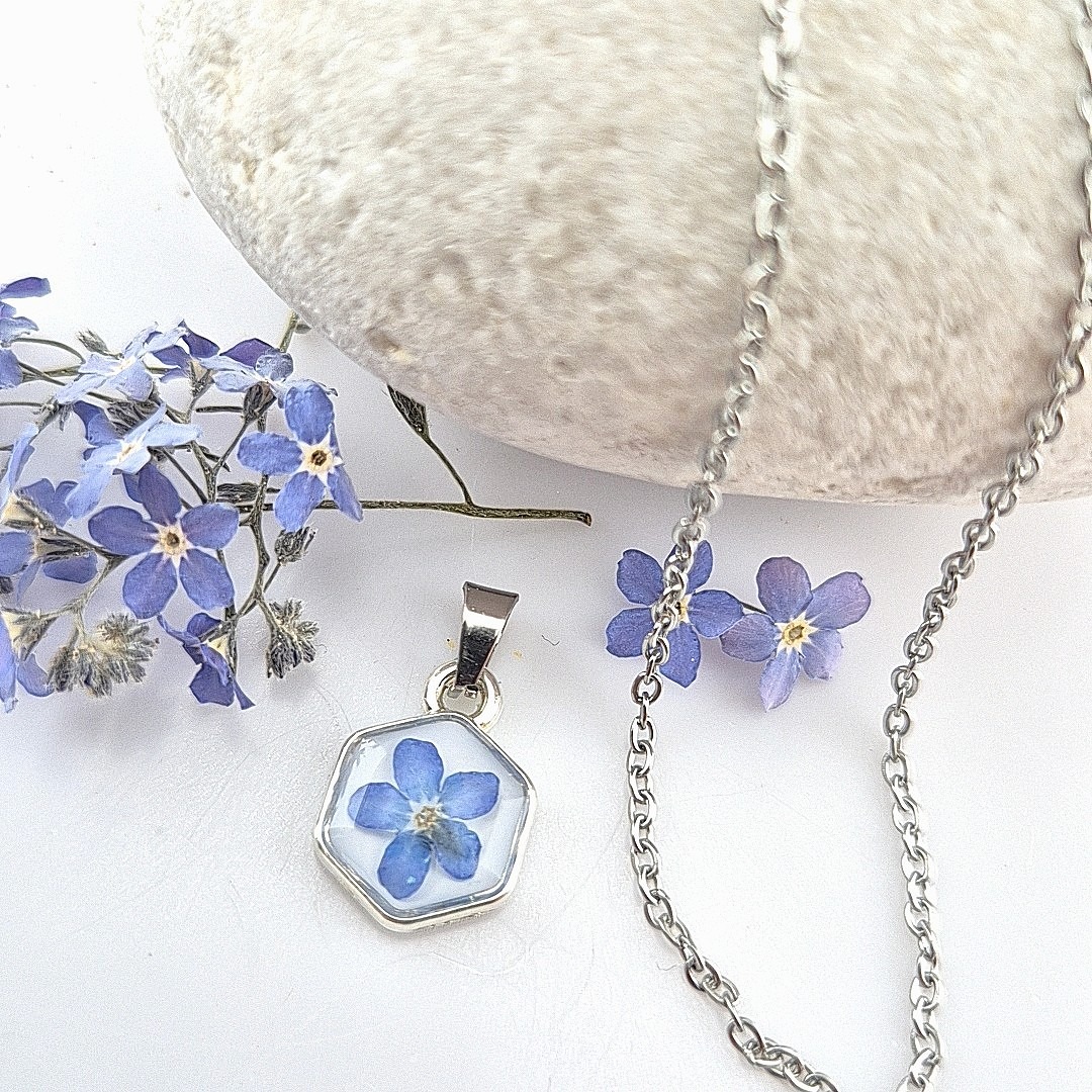 Het vergeet-mij-nietje staat symbool voor liefde, herinnering en verbondenheid. Door de combinatie van natuurlijke bloem en moderne afwerking ontstaat een uniek sieraad dat niet alleen elegant oogt, maar ook een persoonlijke betekenis draagt.
