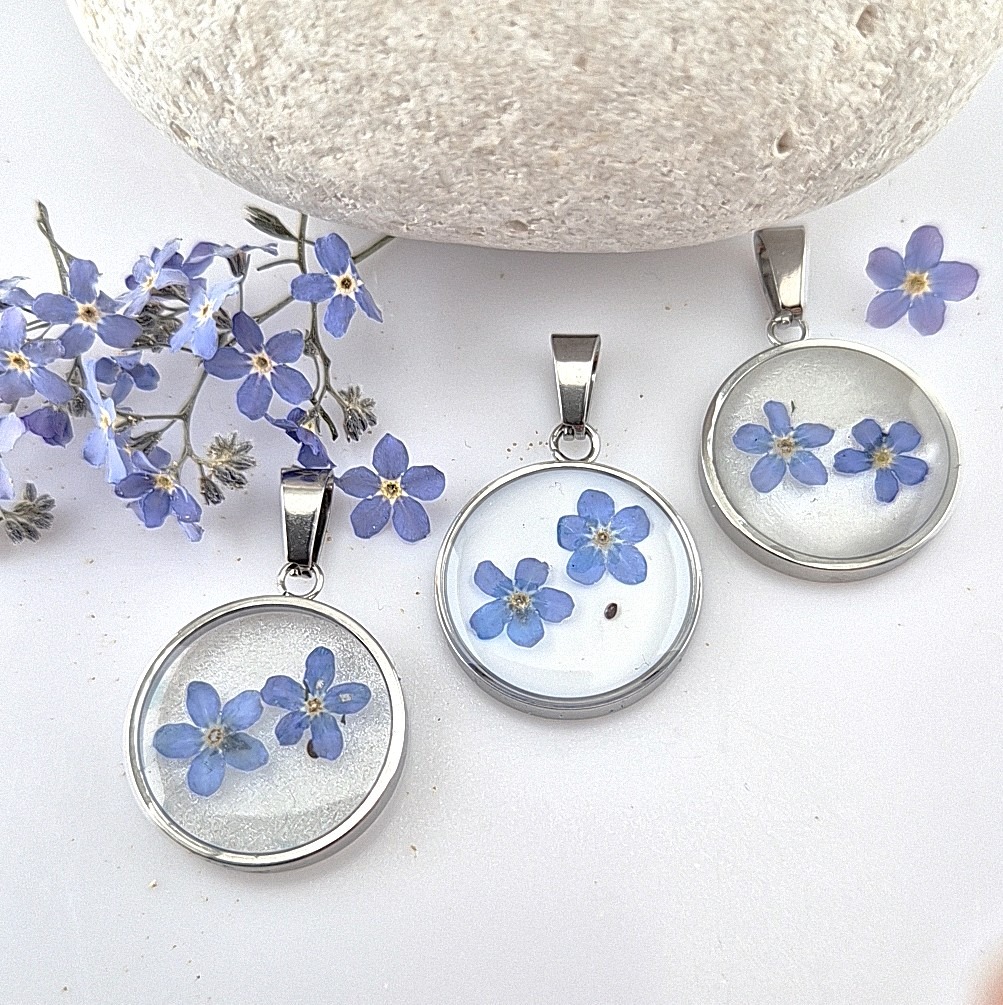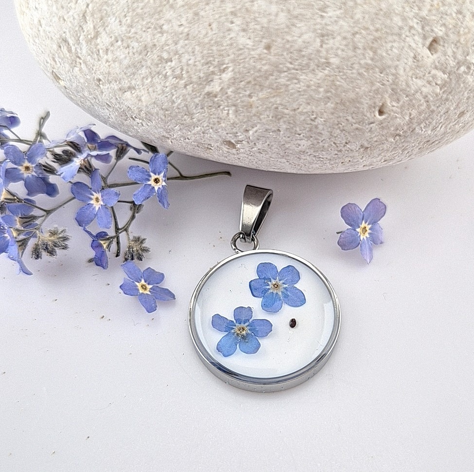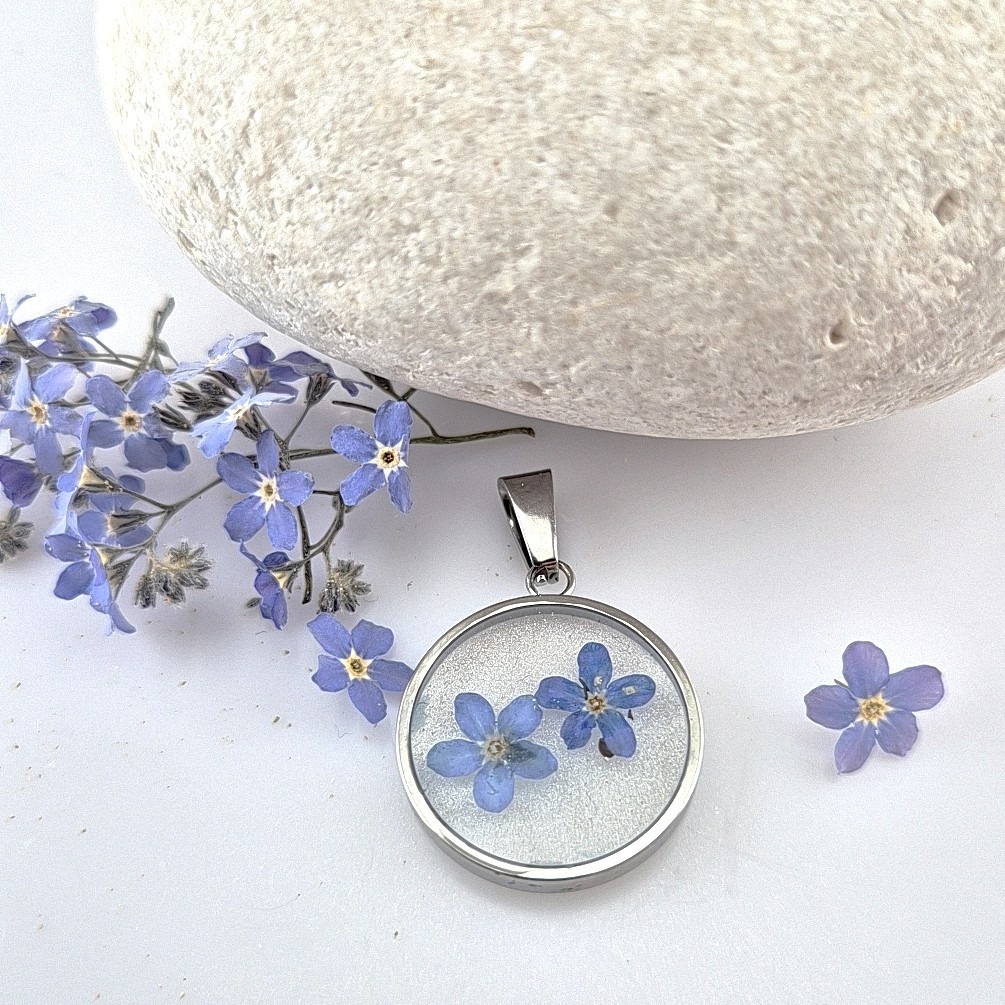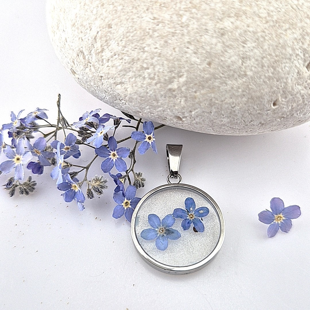 De hanger met subtiele rand word gevuld met gedroogde Vergeet mij nietje gecombineerd met een transparante Uv epoxy hars.