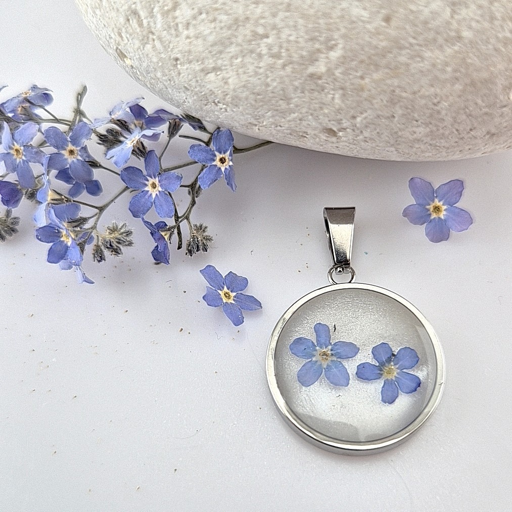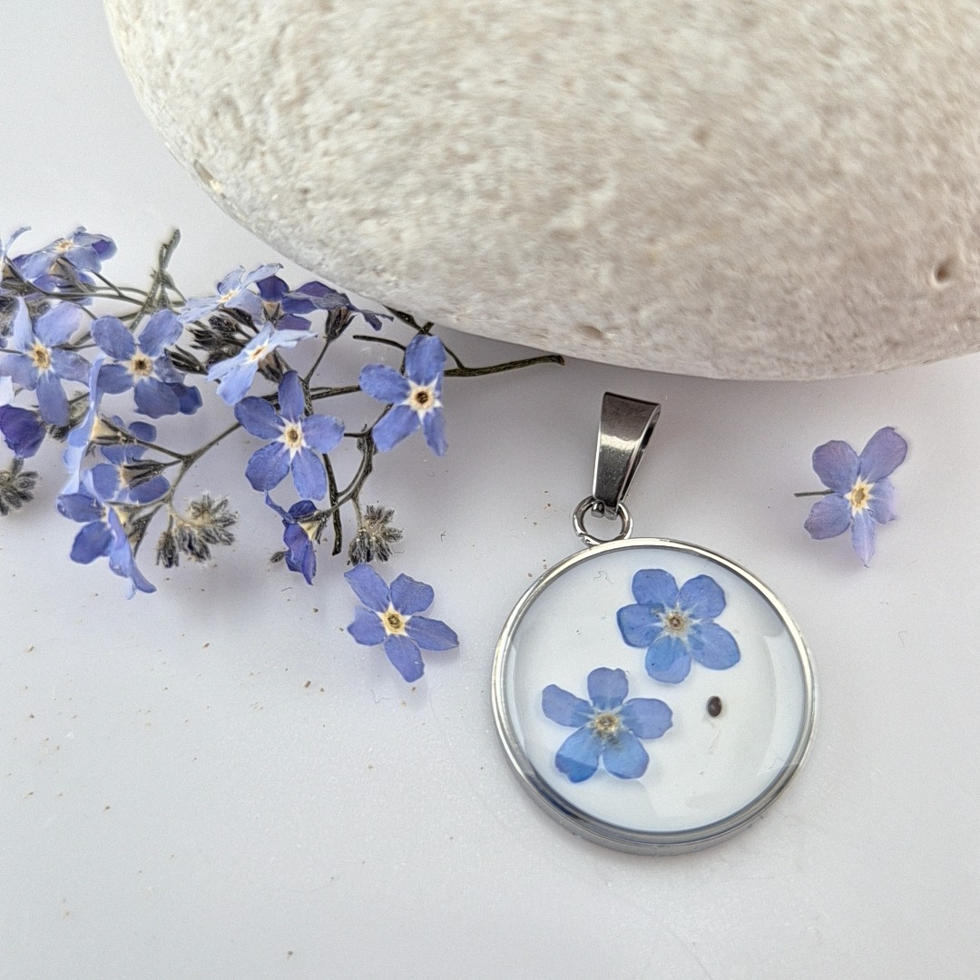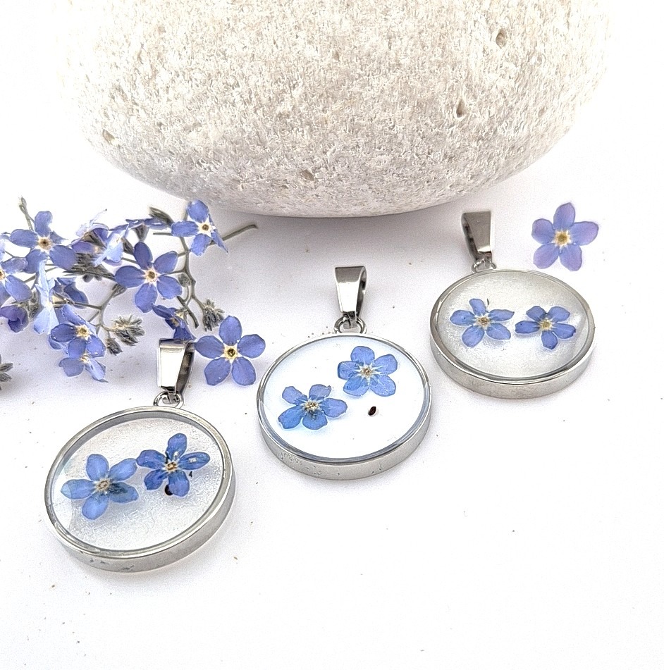 De hanger met subtiele rand word gevuld met gedroogde Vergeet mij nietje gecombineerd met een transparante Uv epoxy hars.