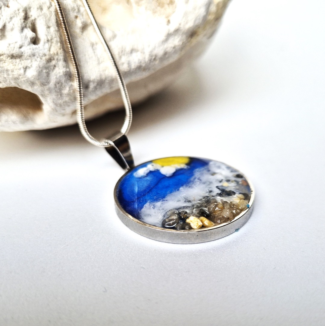 U krijgt de zee zand en epoxy hanger compleet met een zilver plated slangen ketting.