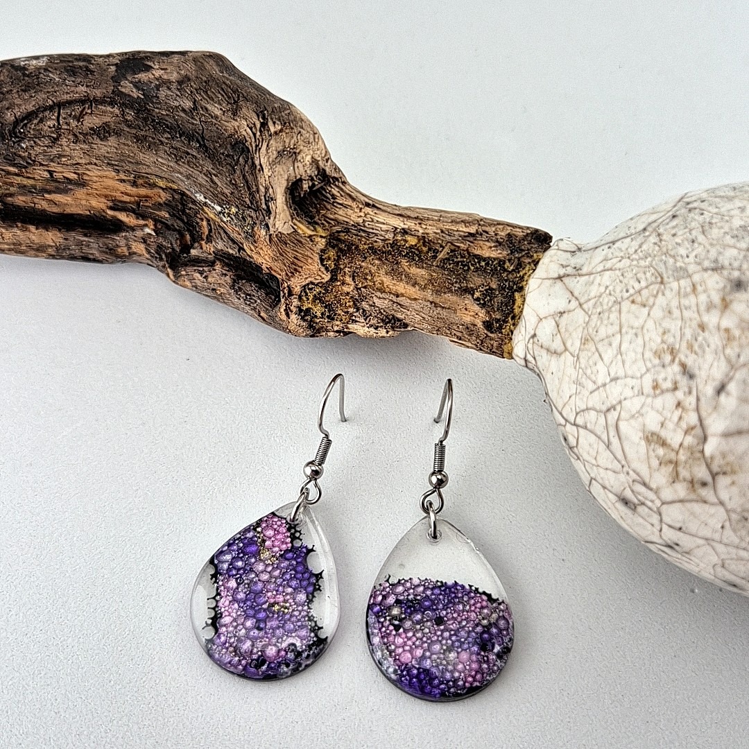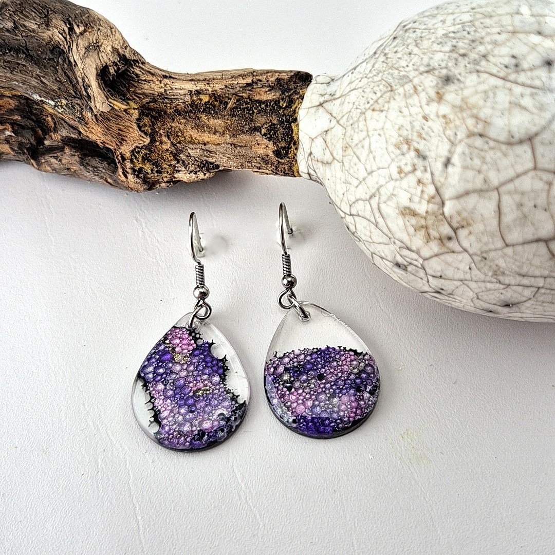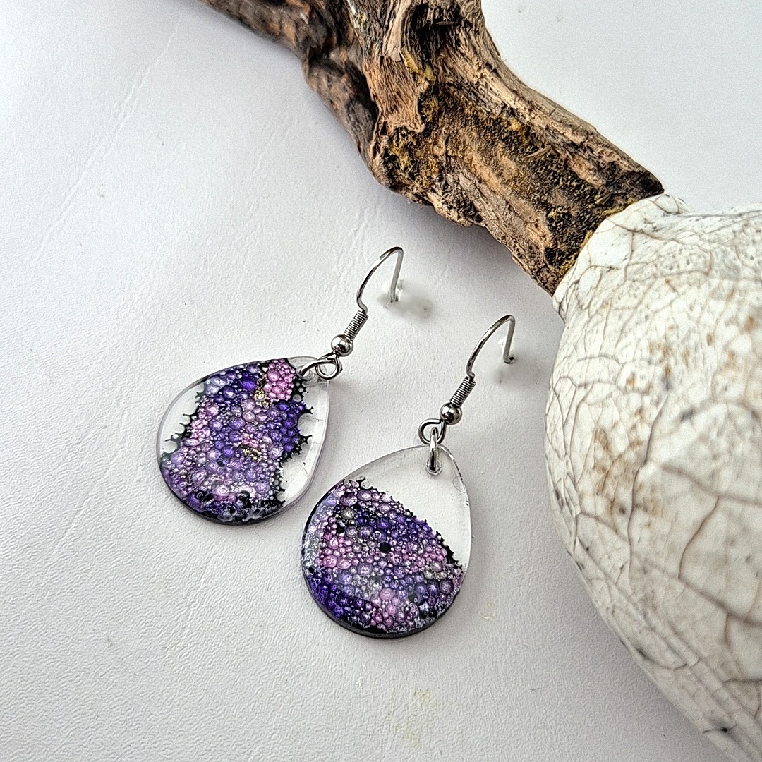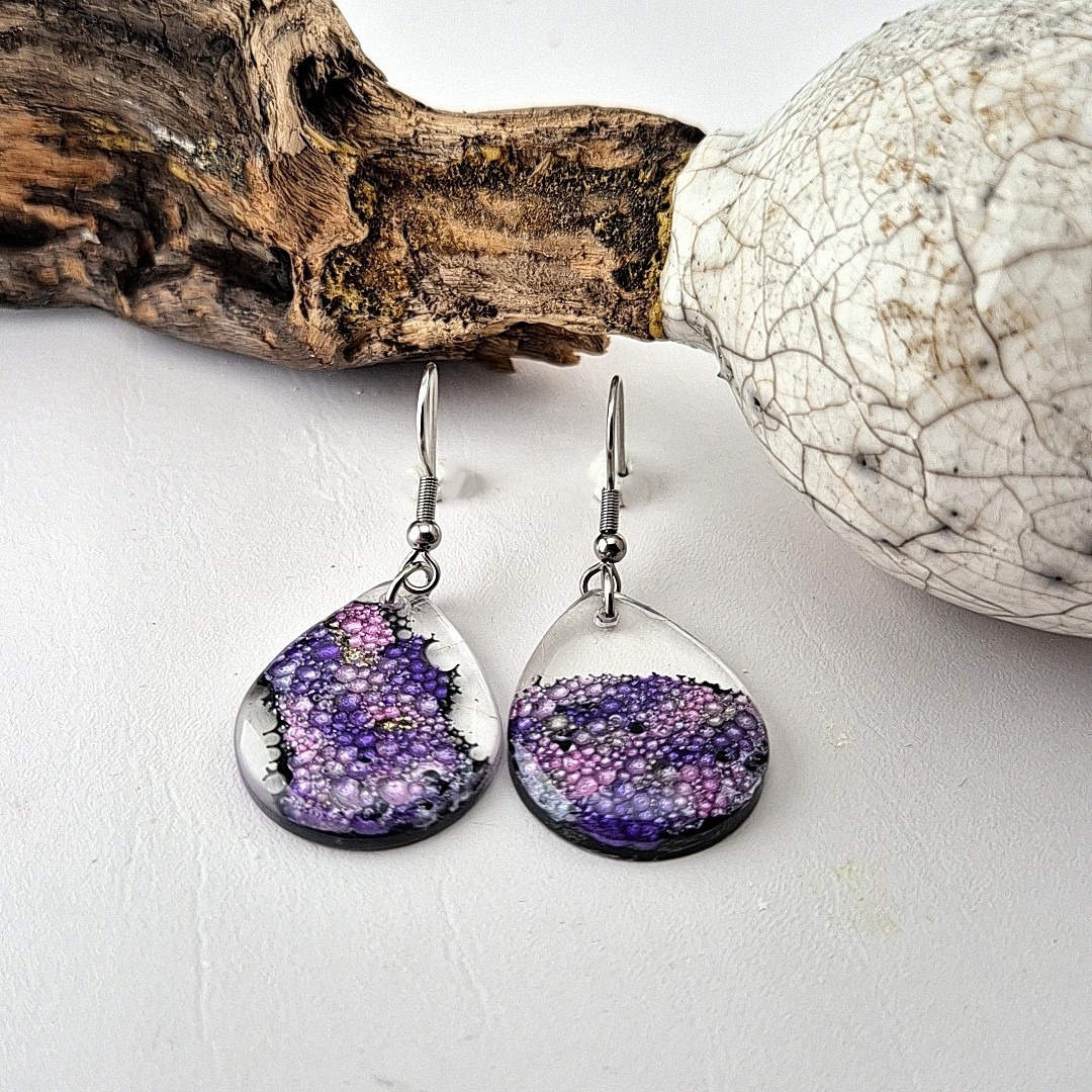 Deze bijzondere Sparkling paarse druppel hang oorbellen zijn met zorg en vakmanschap opgebouwd uit meerdere lagen epoxy. De basis bestaat uit transparante epoxyhars, waarvan ik na het uitharden een deel diepzwart heb gemaakt. Tijdens het uitharden heb ik dit zwarte oppervlak bedekt met zeepsop, waardoor het een prachtig natuurlijk krater‑effect kreeg, speels, organisch en vol diepte.