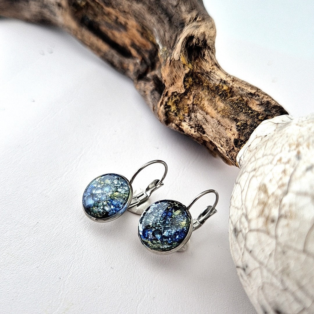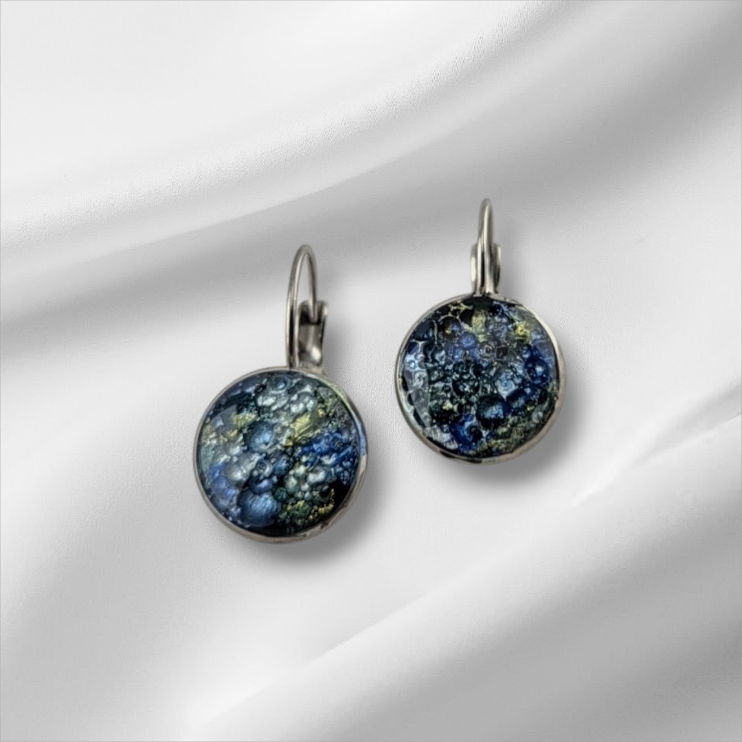 Deze bijzondere RVS cabochon epoxy oorbellen blauw - groen zijn met zorg en vakmanschap opgebouwd uit meerdere lagen epoxy.