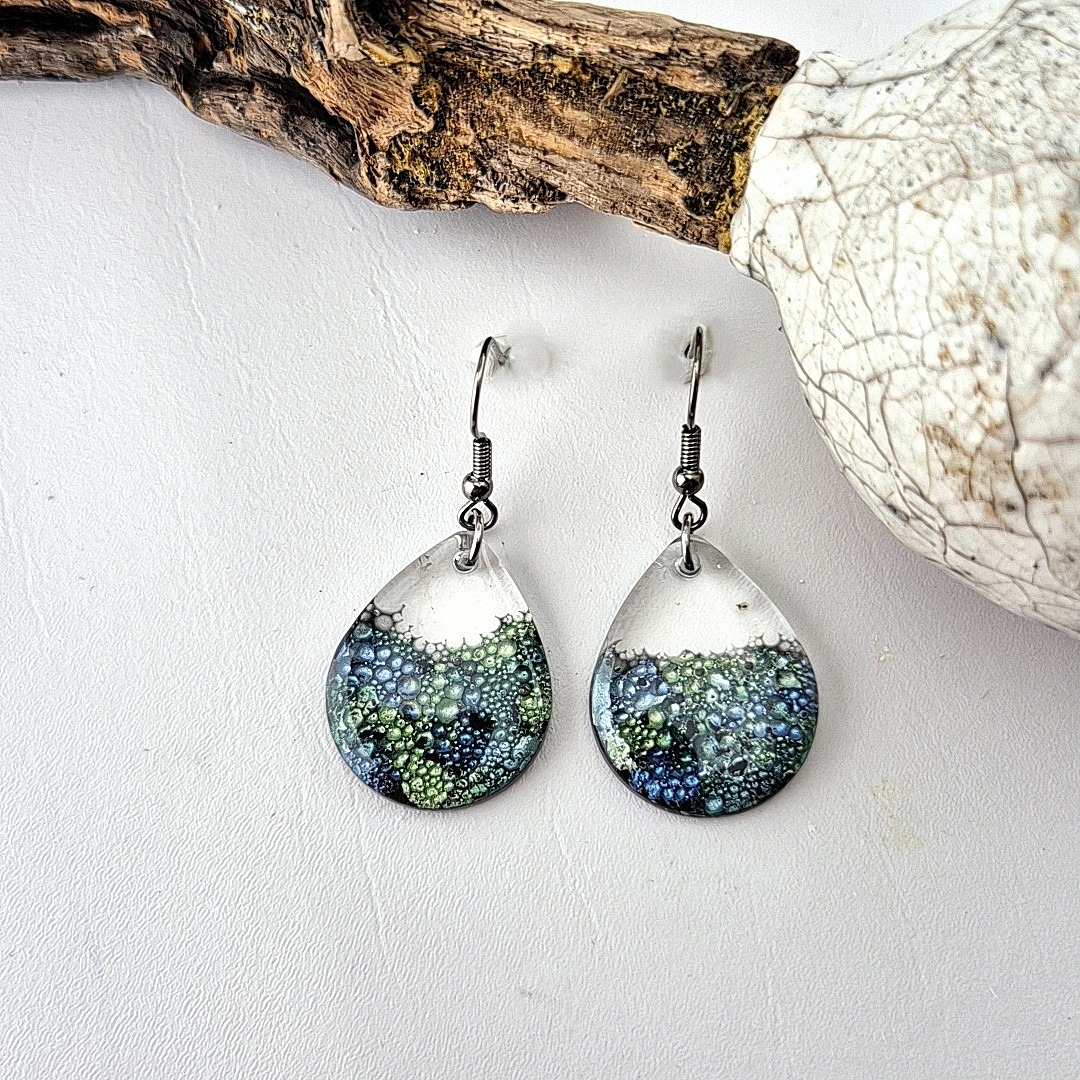 Deze bijzondere groen blauwe sparkling epoxy oorbellen zijn met zorg en vakmanschap opgebouwd uit meerdere lagen epoxy. De basis bestaat uit transparante epoxyhars, waarvan ik na het uitharden een deel diepzwart heb gemaakt. Tijdens het uitharden heb ik dit zwarte oppervlak bedekt met zeepsop, waardoor het een prachtig natuurlijk krater‑effect kreeg, speels, organisch en vol diepte.