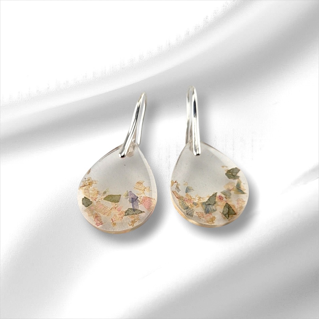 De gedroogde bloemen worden met de hand geselecteerd en in kleine mallen geplaatst, zodat elk paar oorbellen een eigen compositie heeft. Na het gieten wordt de epoxy laag voor laag geschuurd en gepolijst, tot een gladde, glanzende afwerking ontstaat die de kleuren prachtig laat stralen. De roestvrijstalen pin zorgt voor comfortabel en veilig draagplezier.