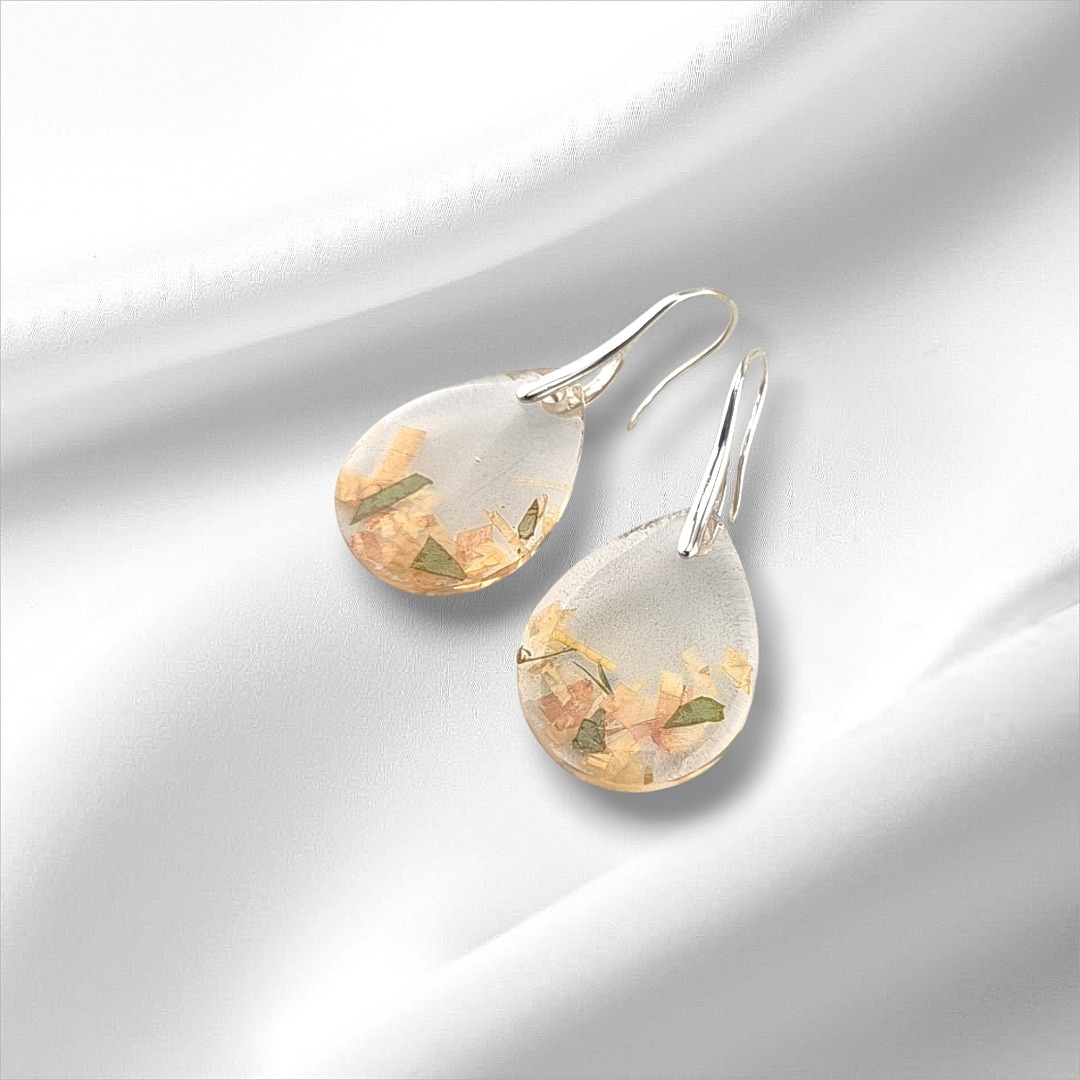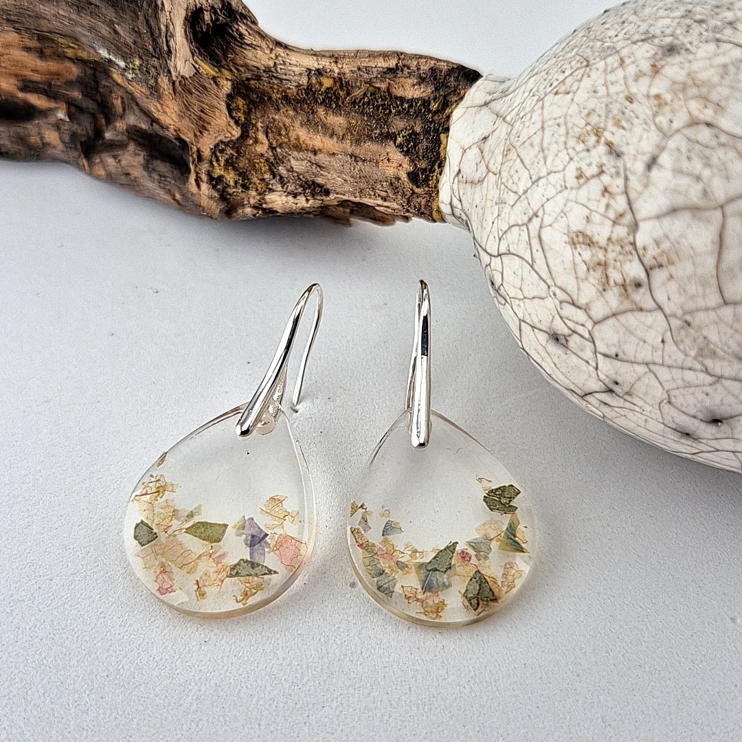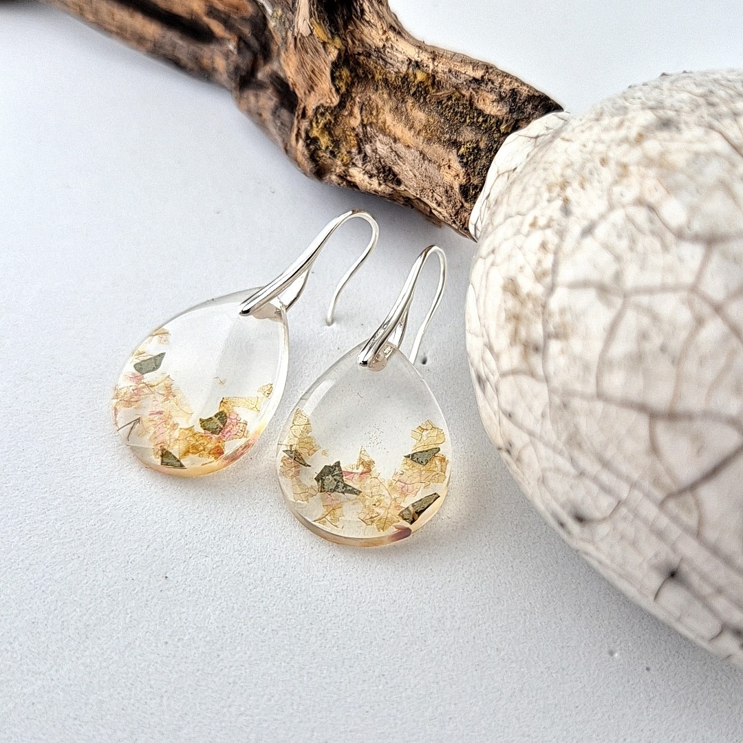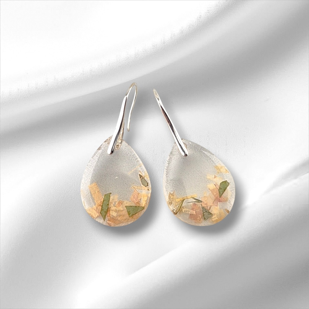 De gedroogde bloemen worden met de hand geselecteerd en in kleine mallen geplaatst, zodat elk paar oorbellen een eigen compositie heeft. Na het gieten wordt de epoxy laag voor laag geschuurd en gepolijst, tot een gladde, glanzende afwerking ontstaat die de kleuren prachtig laat stralen. De roestvrijstalen pin zorgt voor comfortabel en veilig draagplezier.