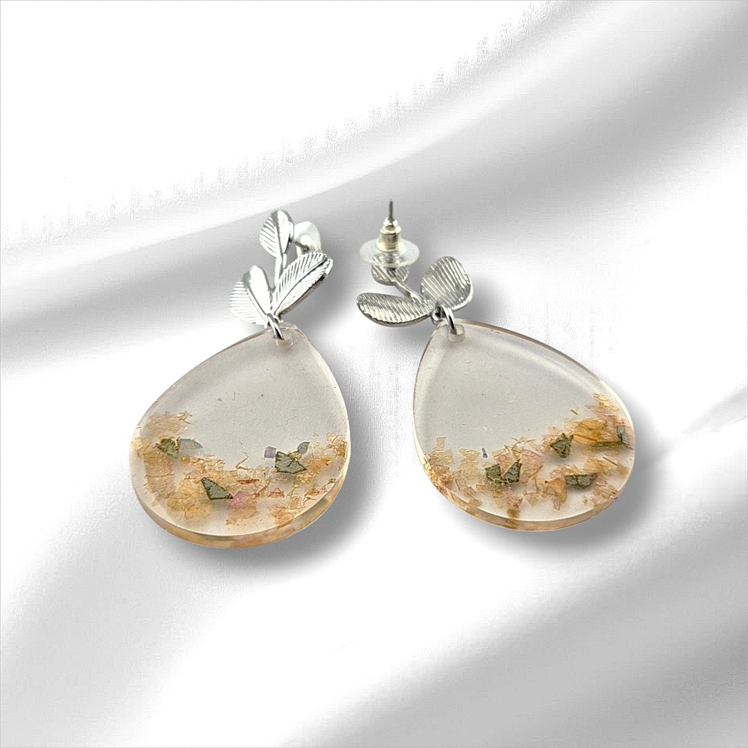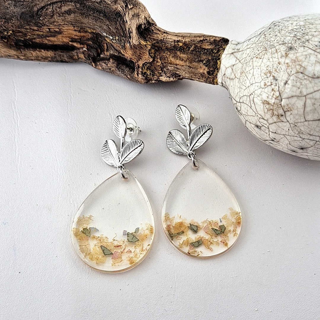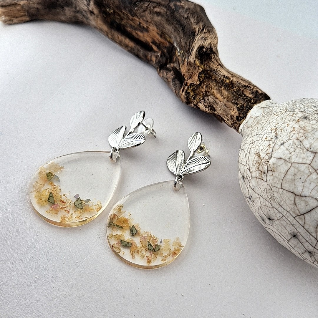 De gedroogde bloemen worden met de hand geselecteerd en in kleine mallen geplaatst, zodat elk paar oorbellen een eigen compositie heeft. Na het gieten wordt de epoxy laag voor laag geschuurd en gepolijst, tot een gladde, glanzende afwerking ontstaat die de kleuren prachtig laat stralen. De roestvrijstalen pin zorgt voor comfortabel en veilig draagplezier.