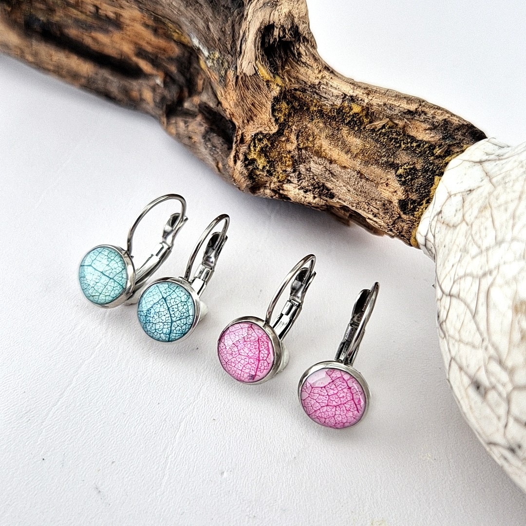 De Blauwe of roze gekleurde bladnerf oorbellen vervaardigd met een dekkende witte ondergrond en een stukje verfijnde bladnerf van een lindeblad, stralen een diepe, rijke kleur uit die onmiddellijk de aandacht trekt.