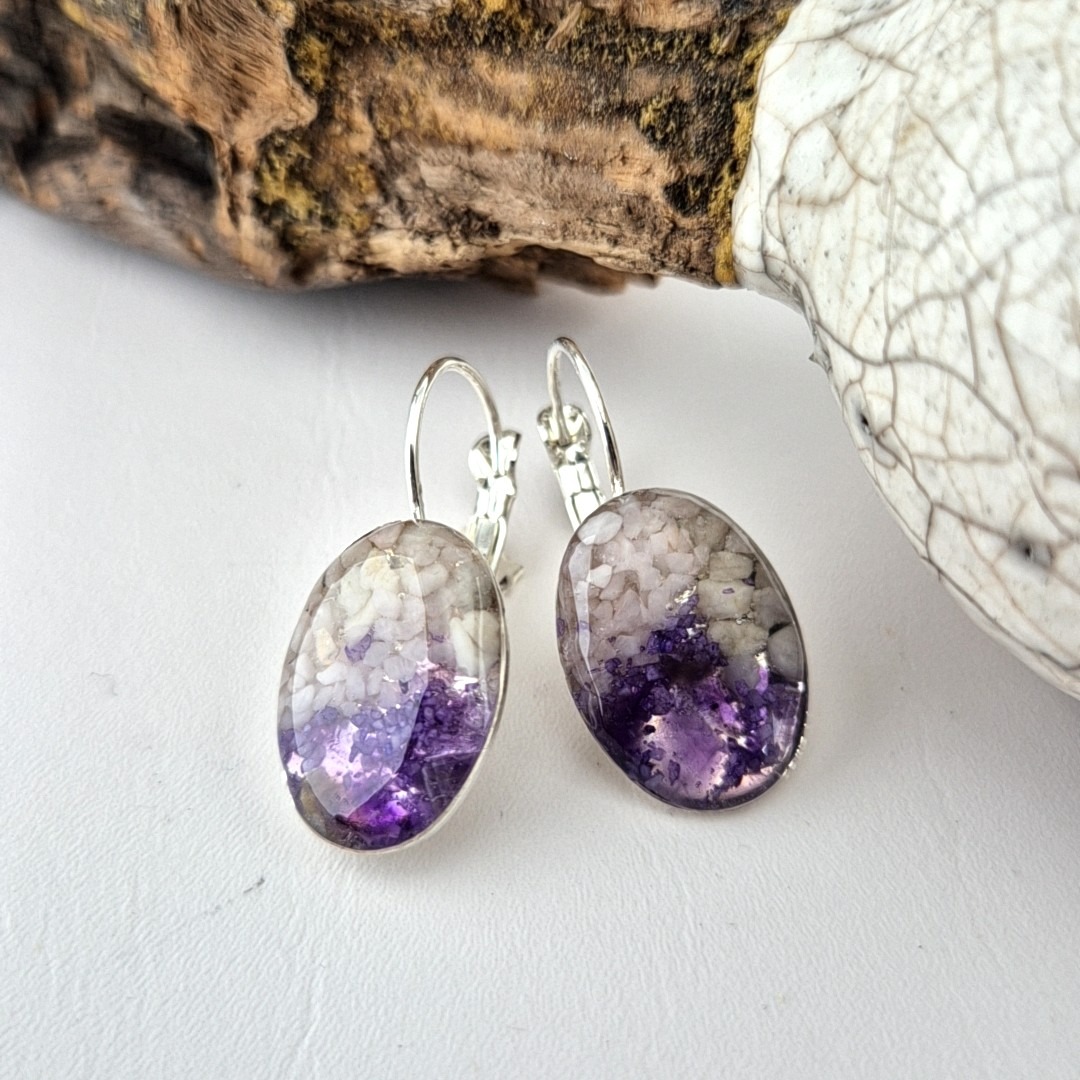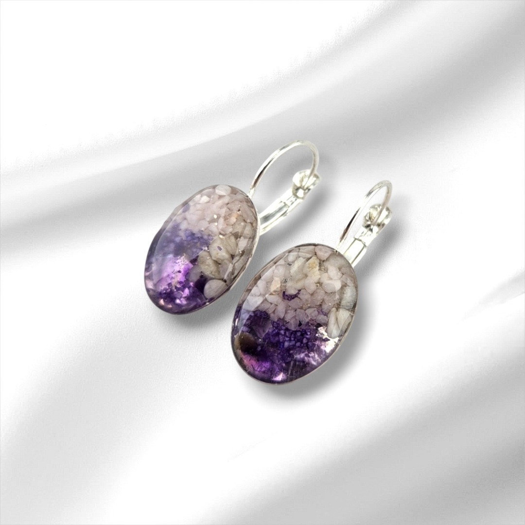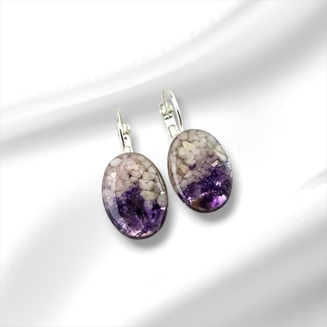 In deze oorbellen met Rozenkwarts - Amethist - zand komen drie elementen samen die elk hun eigen verhaal fluisteren: het zachte zand, de paarse glans van Amethist en de heldere diepte van epoxyhars. Samen vormen ze een klein kunstwerk dat de rust van de natuur en de kracht van innerlijke helderheid met zich meedraagt.
