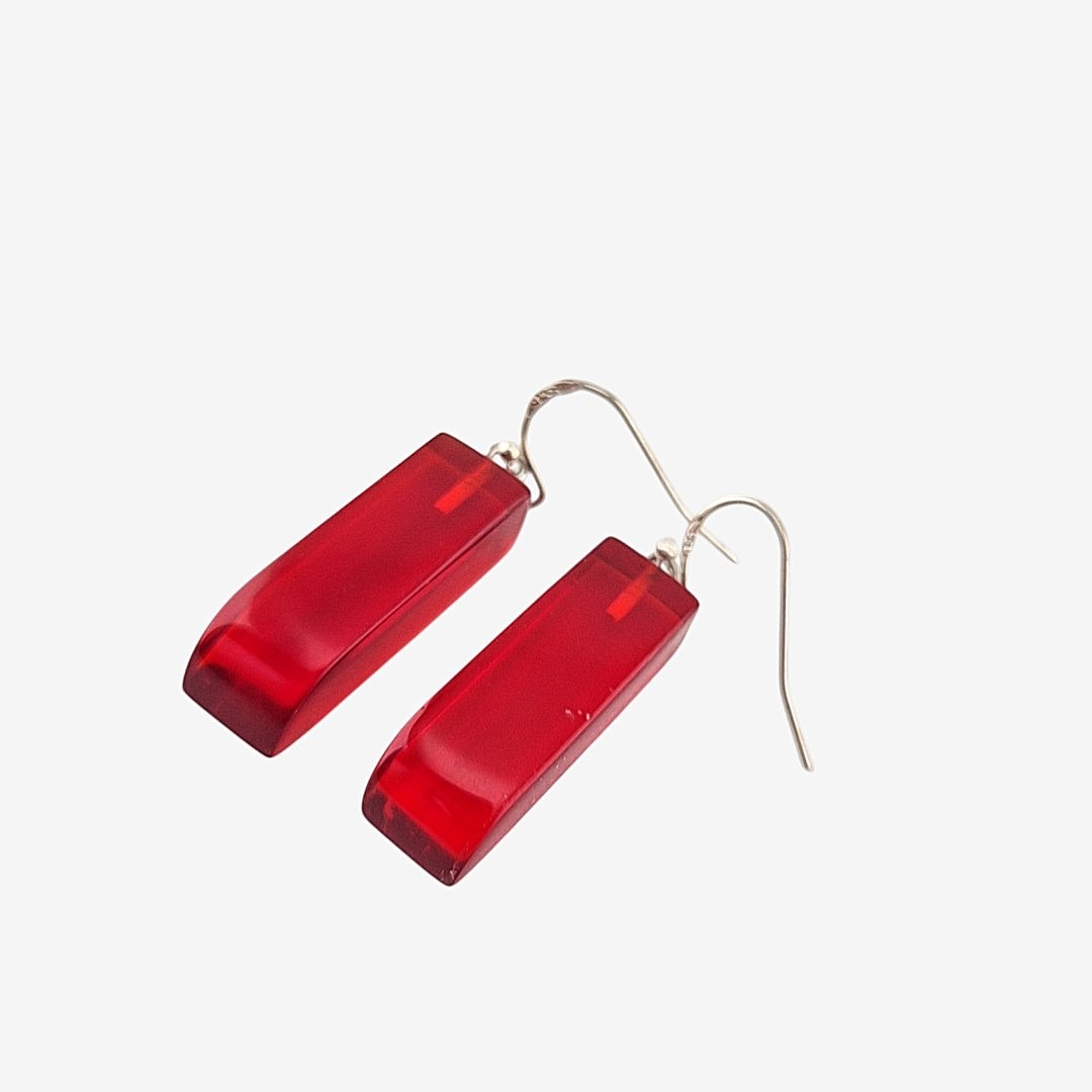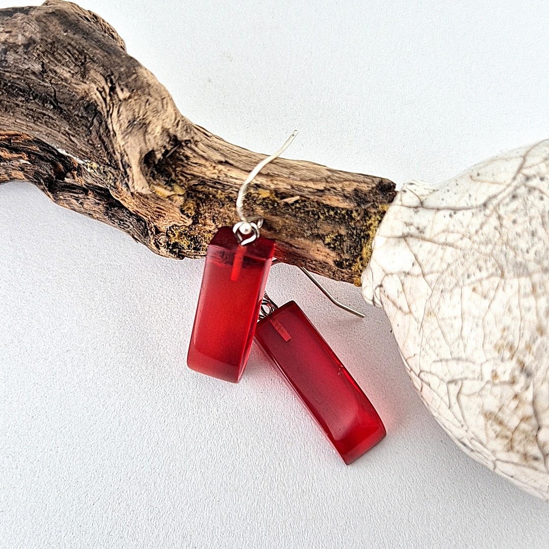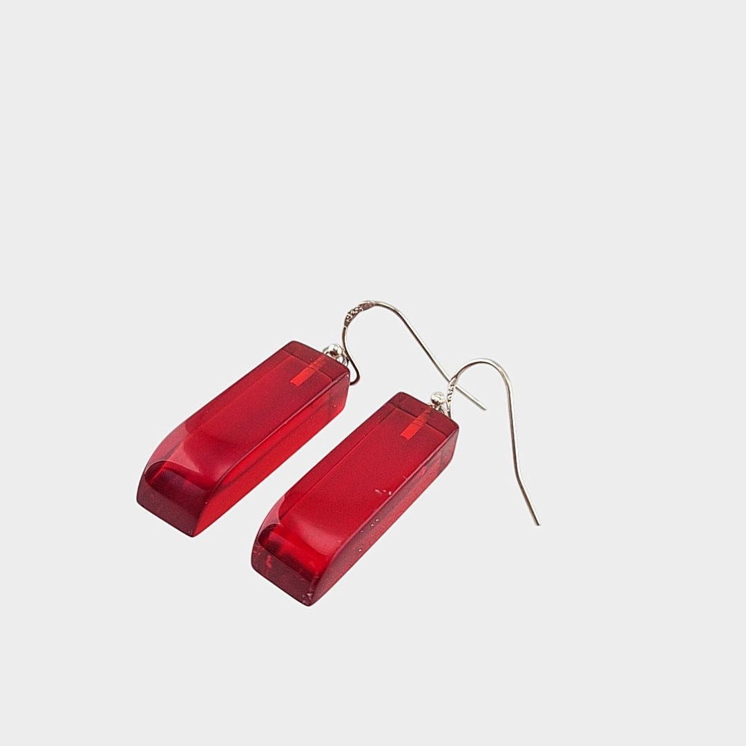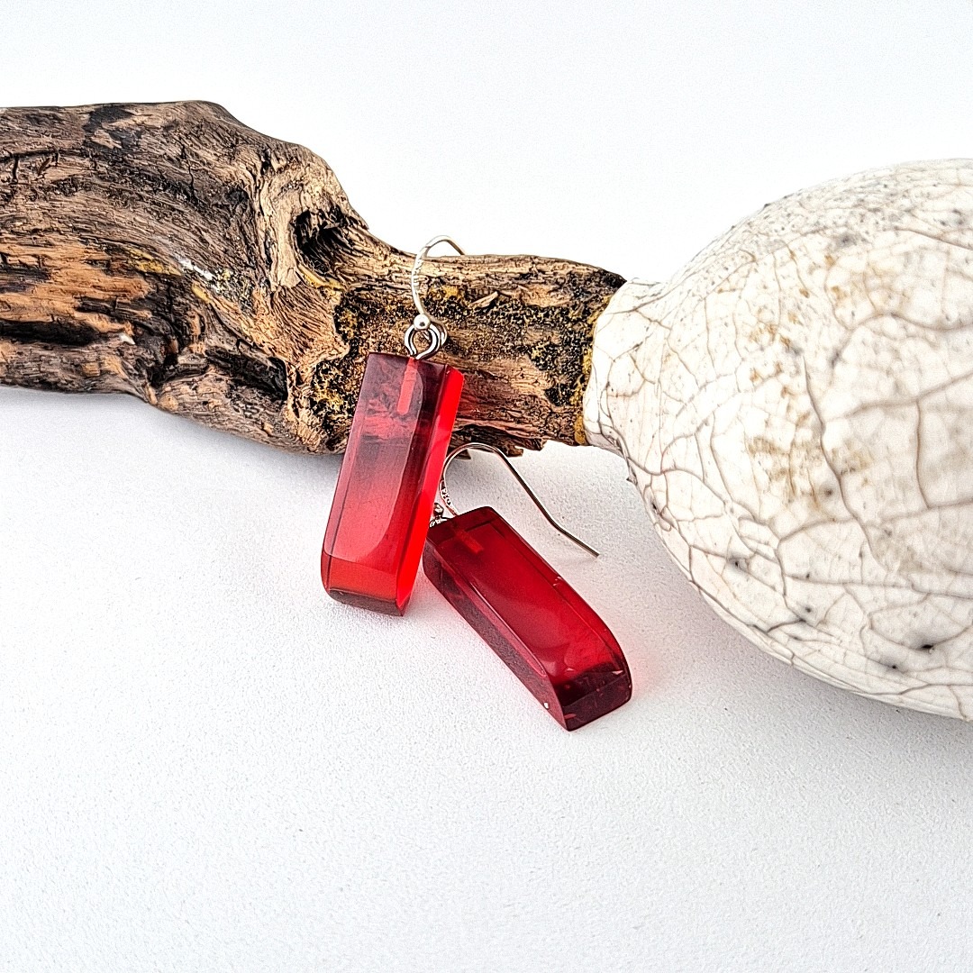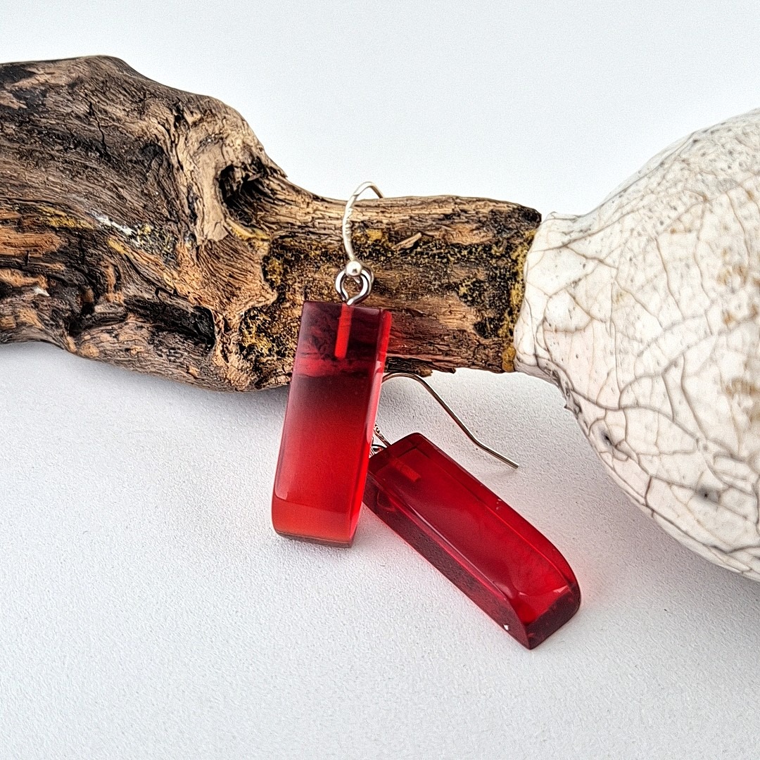 De handgemaakte, Rode langwerpige epoxy oorbellen, zijn een echte blikvanger. Ze zijn gegoten uit transparante rode epoxyhars en na het uitharden zorgvuldig uitgezaagd tot hun elegante vorm. Vervolgens zijn ze volledig met de hand geschuurd en gepolijst, laagje voor laagje, totdat het oppervlak glashelder werd en alle oneffenheden verdwenen.