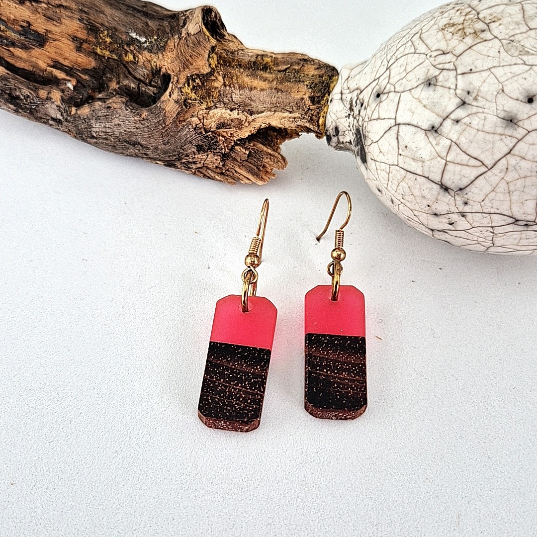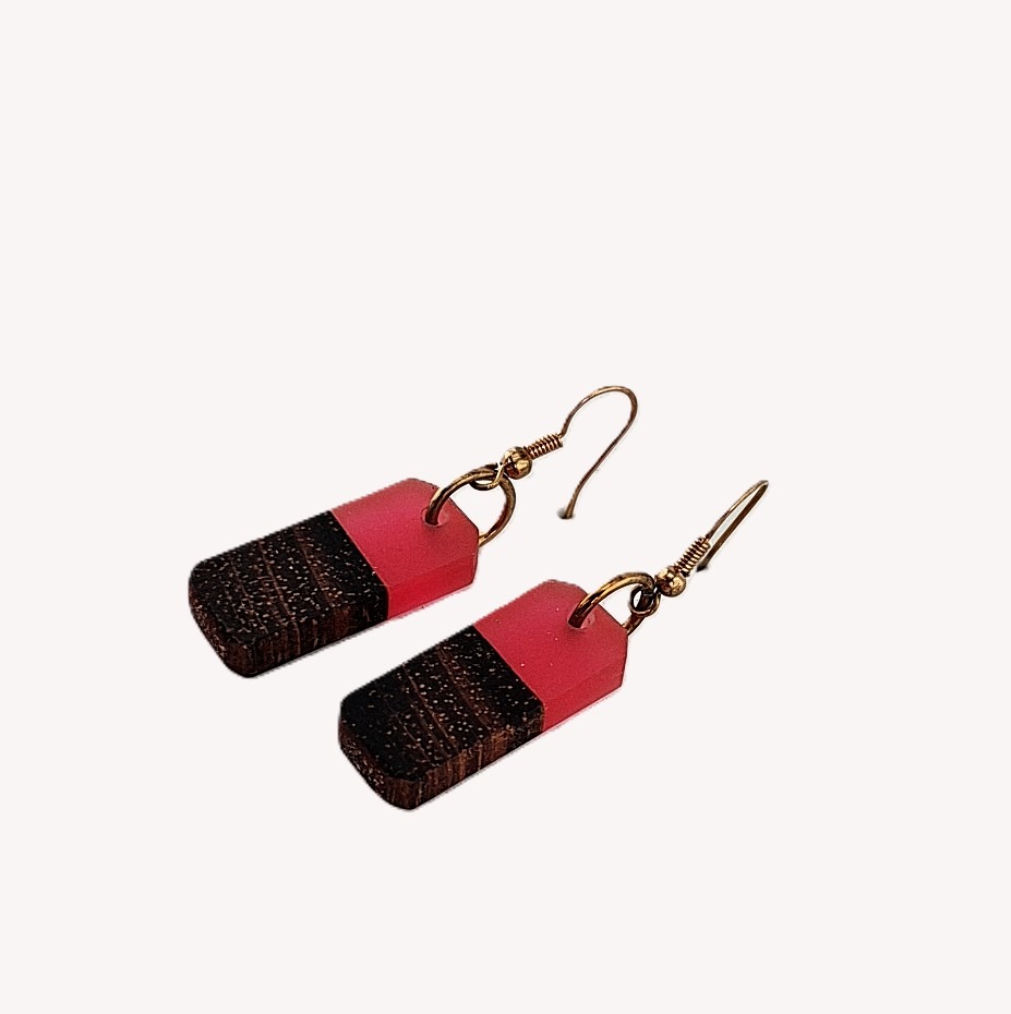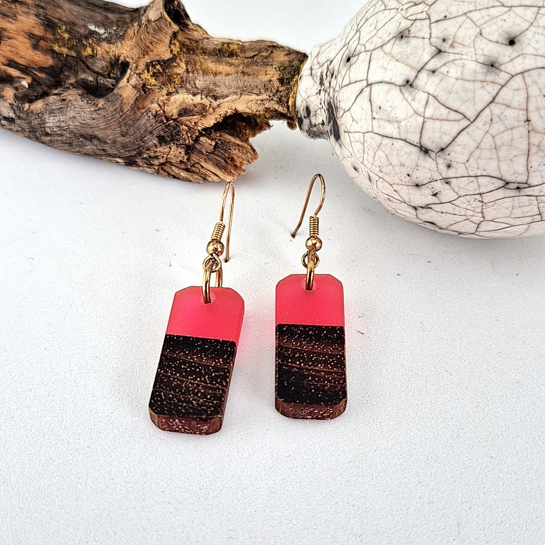 De roze epoxy hout oorbellen met haak zijn een stijlvolle combinatie van modern design en ambachtelijk vakmanschap. Elk paar wordt met zorg met de hand gemaakt, waarbij een subtiel stukje hout wordt samengebracht met diepzwarte epoxy. Deze twee materialen vormen samen een elegant contrast: het warme, natuurlijke karakter van het hout tegenover de strakke, matte uitstraling van de epoxy.