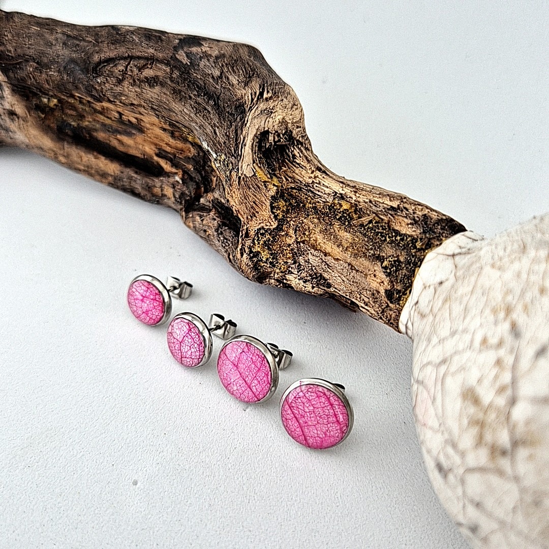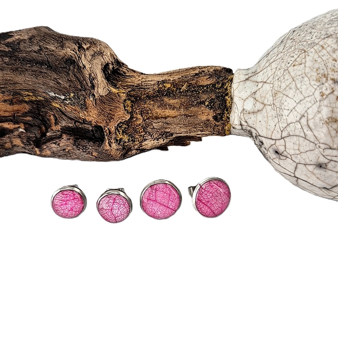 De RVS Ronde cabochon oorbellen met roze bladnerf, vervaardigd met een dekkende witte ondergrond en een stukje verfijnde bladnerf van een lindeblad, stralen een diepe, rijke kleur uit die onmiddellijk de aandacht trekt.