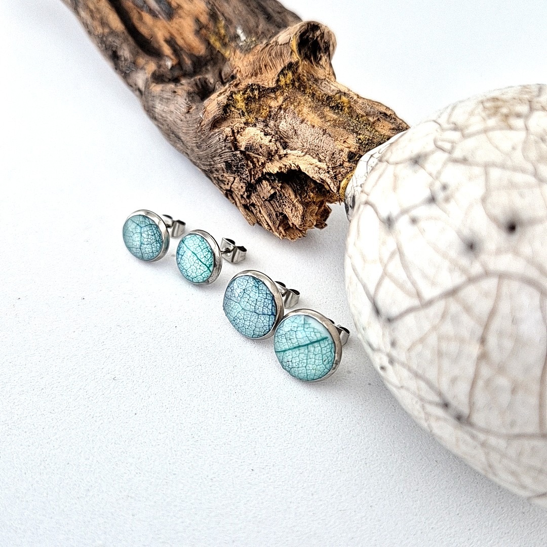 De Ronde rvs cabochon oorbellen met blauwe bladnerf vervaardigd met een dekkende witte ondergrond en een stukje verfijnde bladnerf van een lindeblad, stralen een diepe, rijke kleur uit die onmiddellijk de aandacht trekt.