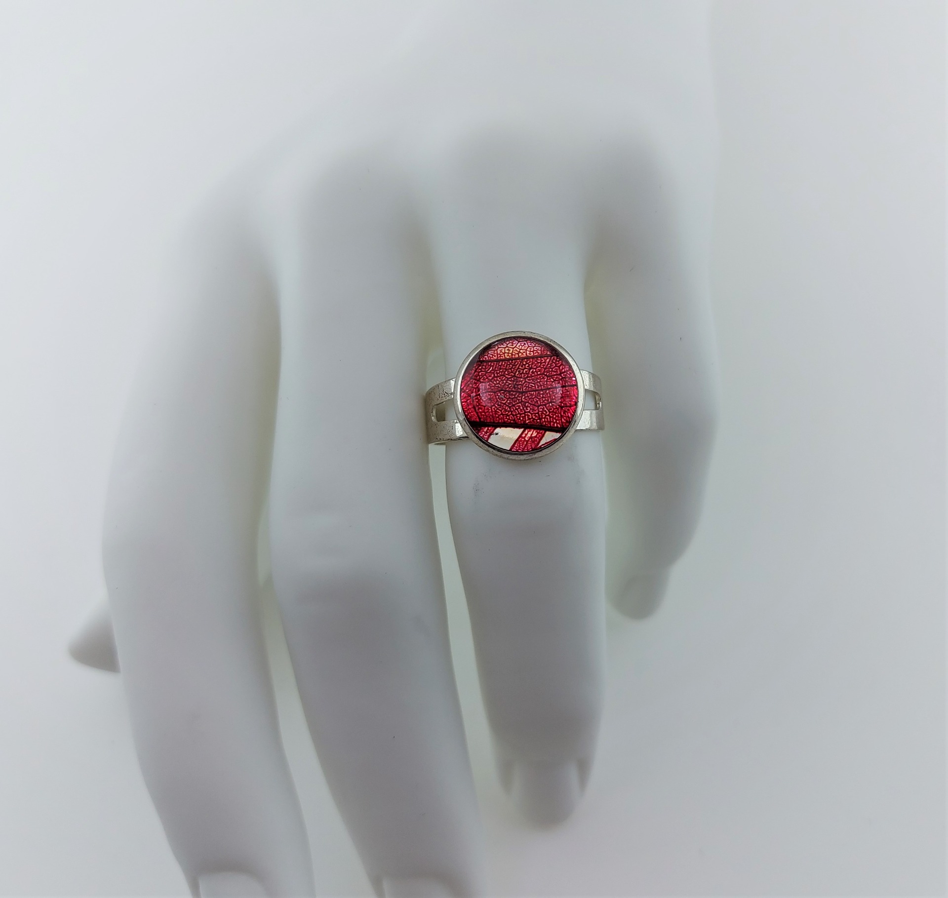 Deze bijzondere zilverkleurige rode bladnerf ring is gemaakt met een stukje bladnerf van een Linde boom die ik met rode inkt heb gekleurd.